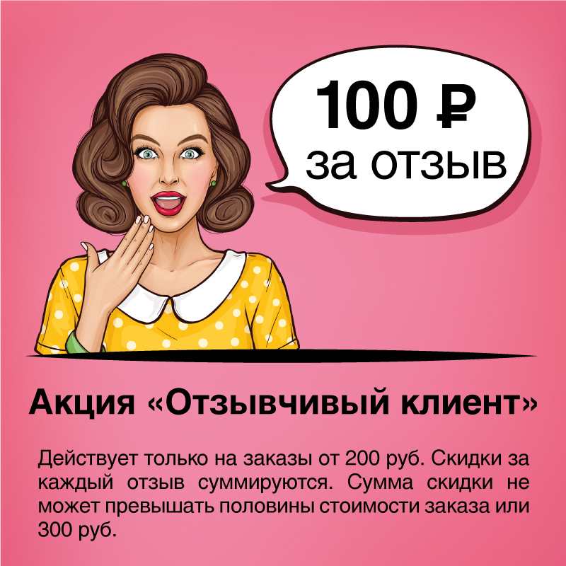 Ваши отзывы для нас очень важны. Мы уверены, что многие заказчики довольны качеством нашей работы, но почему-то стесняются об этом рассказать. Мы решели поддержать скидкой тех кто оставит отзыв о нас на одной из трех площадок Гугл, Яндекс и 2Гис. За каждый отзыв мы даем скидку 100 руб. Если отзыва два скидка 200 руб, три отзыва то скидка сразу 300 руб. (не более).
